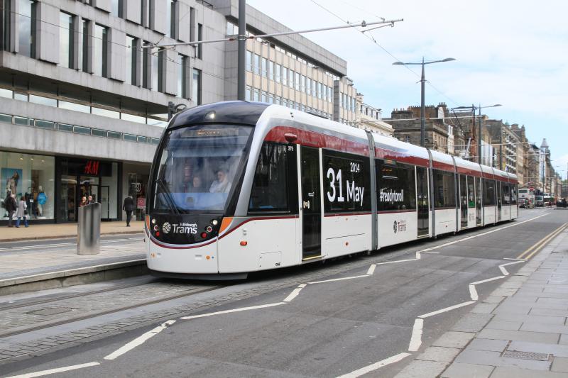 - Tram 275 advertising the start date of Edinburgh trams on 02/05/2014 in Princes Street.