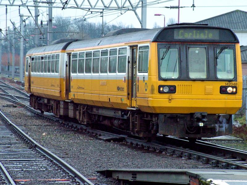 - Wearing the Merseyrail livery, 142048 arrives at Carlisle with a service from Barrow in Furness, on 12th January 2008