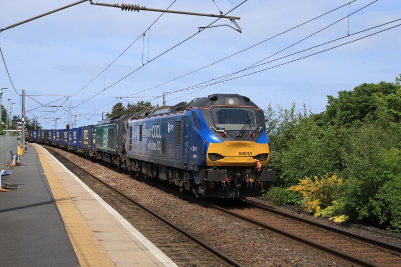 - 88010 + 68005 on 4Z48 12.15 Mossend Euroterminal to Daventry passing Newcraighall on 28/05/2023 Pantograph still to be raised