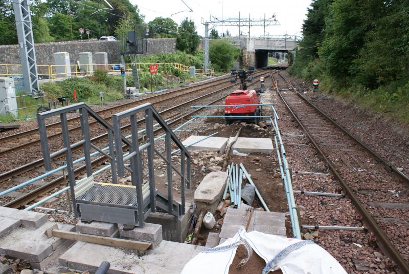 - Looking from what is now the south end of the island platform at Dunblane. The bases for new Up direction signal posts DB49 (P.2) and DB51 (P.3) have been cast. Is the large girth cable that has been exposed the current mains power supply from the Tesco car park area and will become redundant once the new DNO Cabinet is hooked into? 14.08.23